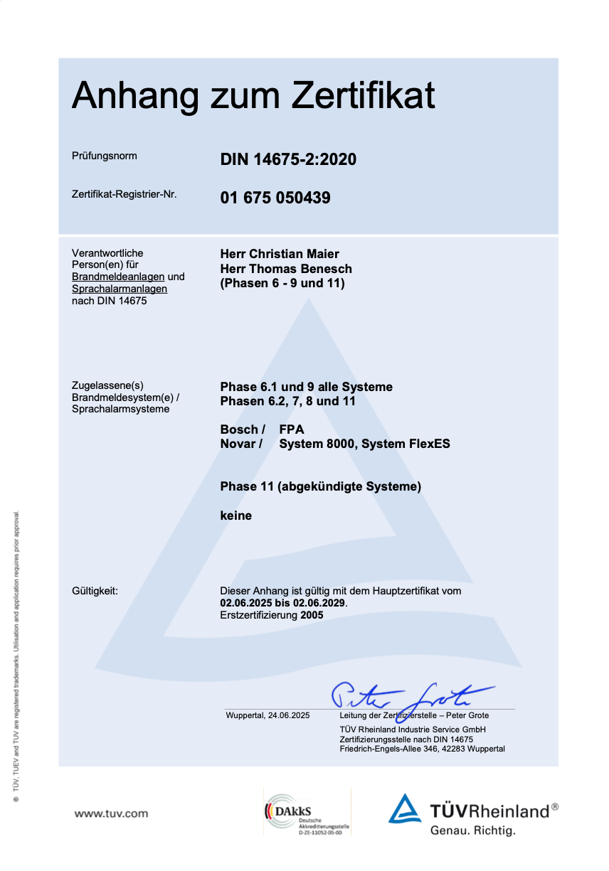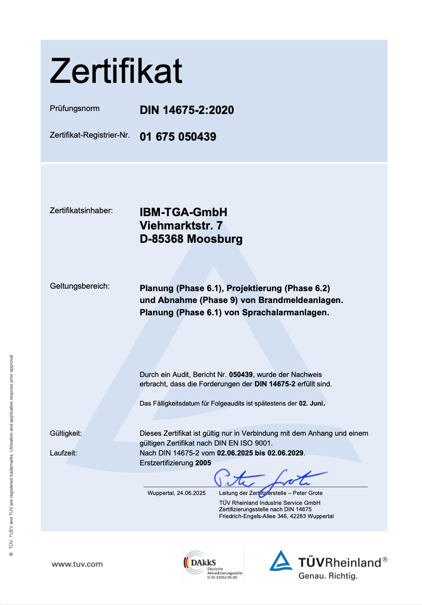 Die IBM-TGA-GmbH ist ein zertifiziertes Ingenieurbüro, geprüft vom TÜV Rheinland nach DIN 14675. Das gibt Ihnen eine solide Basis für eine sichere Planung (Phase 6.1), die Projektierung (Phase 6.2) und Abnahme (Phase 9) von Brandmeldeanlagen. Obendrauf erfüllen wir alle Anforderungen der ISO 9001:2015 – ein echtes Qualitätssiegel für unsere Ingenieurleistungen in der Technischen Gebäudeausrüstung unter Berücksichtigung aller Phasen nach HOAI und speziell im Bereich Elektro- und Brandmeldetechnik.